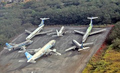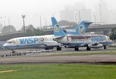 2011年6月 ブラジル・サンパウログアリューリョス空港での廃機体。2005年に破綻したVASP機が3機。大きなA300が1機、B737-200が2機です。奥にはFLYとかかれたB727-200と、もうひとつB727-200が。真ん中の白い機体はB737-200だと思います。ちなみにターミナルの拡張工事のため、この半年後には撤去されていました。 |