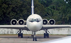 VC-10というのはイギリスのビッカース社(のちにBAC社となる)がボーイング707やダグラスDC-8に対抗して開発した(当時としては)大型4発エンジン機で、後部に4基エンジンを設置することで主翼をクリア―にし、離着陸性能を向上させる・・・というコンセプトで設計された機体です。1964年4月に英国航空で就航しました。アイディアは良かったのですが、作ってみると、航続性能も、機体の容量も特筆して優れているわけでもなく、信頼性も経済性も上のアメリカ機の方がいい・・・と市場の評判が芳しくなく、結局54機で生産中止。輸出もほとんどできなかった(東アフリカでわずか使われたらしい)という機体です。ジェット機が出始めの時代と言えボーイング707が1010機、DC-8が556機生産されている事実から言えば、VC-10は失敗機ともいえるのですが、そのVC-10を模範にして設計された(といわれる)IL-62が未だに飛んでいるのを見ると、なんともいえない感慨を感じます。