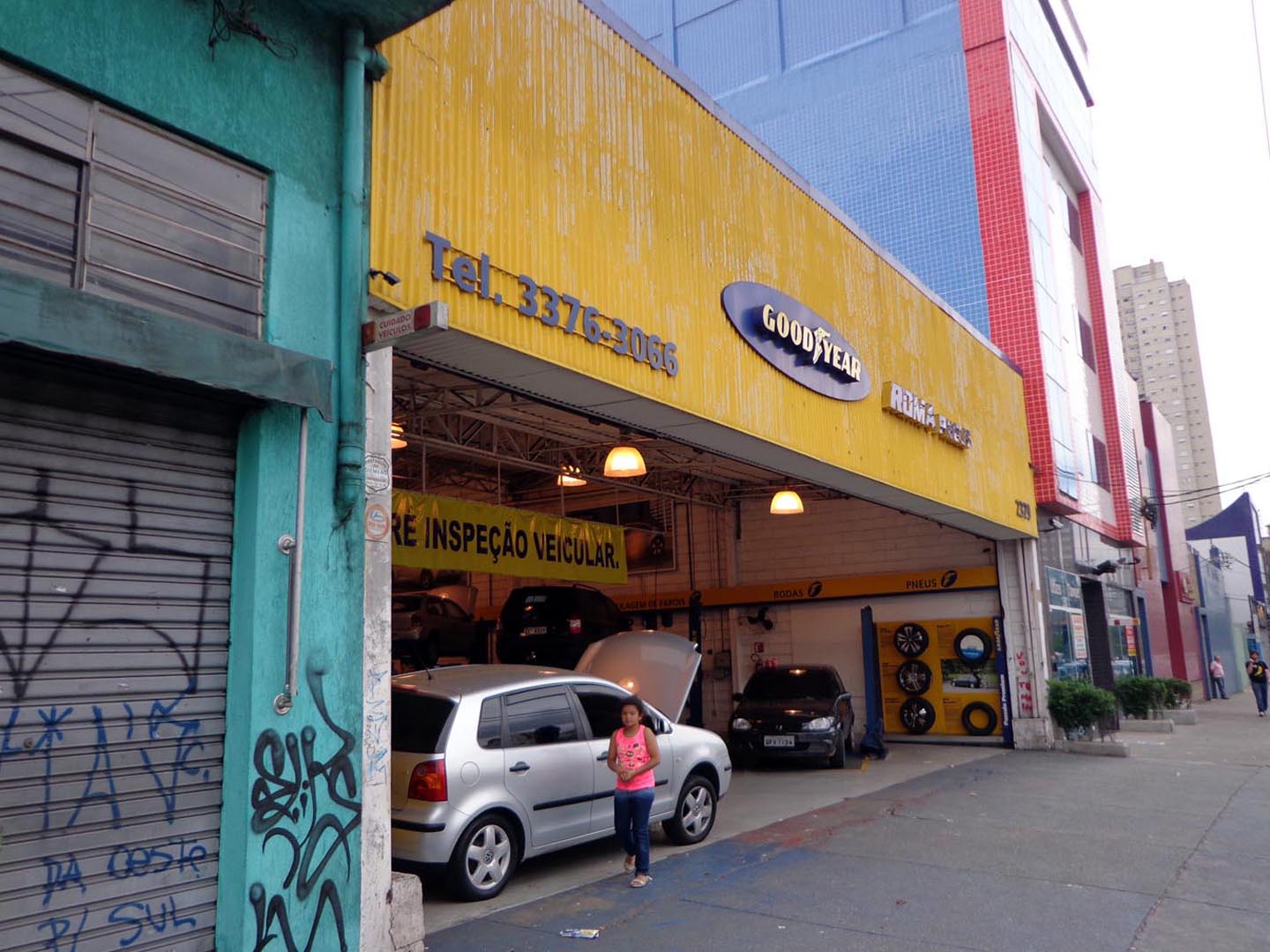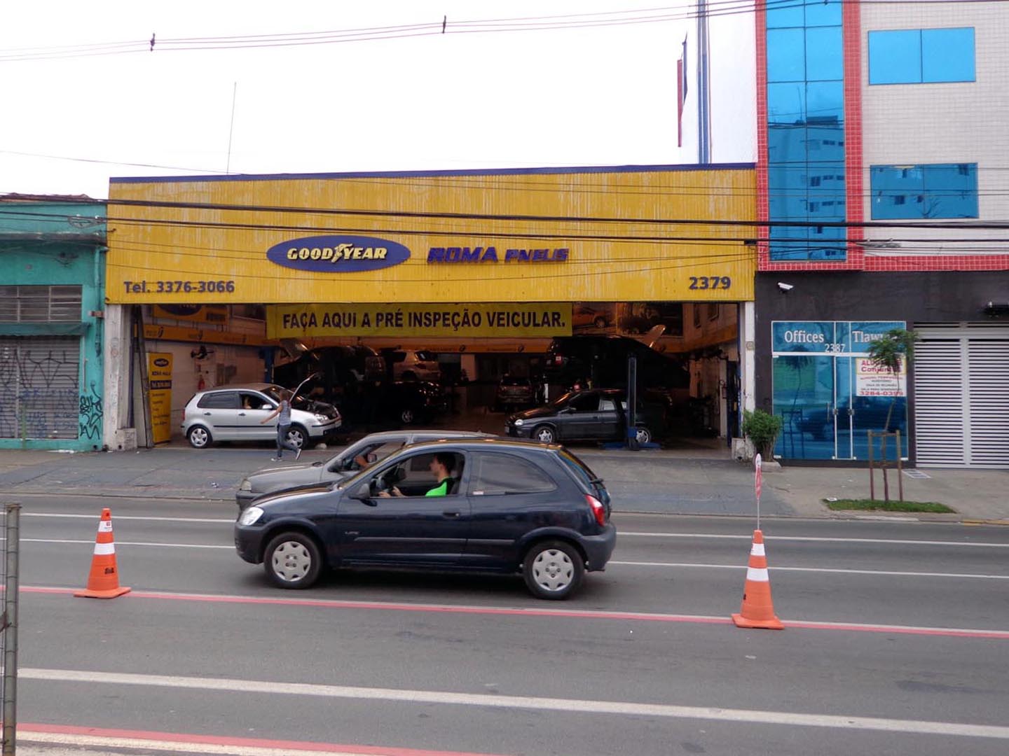 - そこで、周りの人に聞くと、「Vila Marianaヴィラ・マリアーナあたりにそれらしい店がたくさんあるよ」との話。それならば、と思いたち出向いてみたのがこんな感じのところでした。確かに他地区に比べると多少規模が大きくなったタイヤ店が何件かありました。そこで入ったのが・・・。