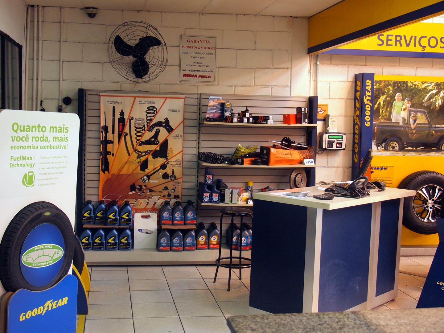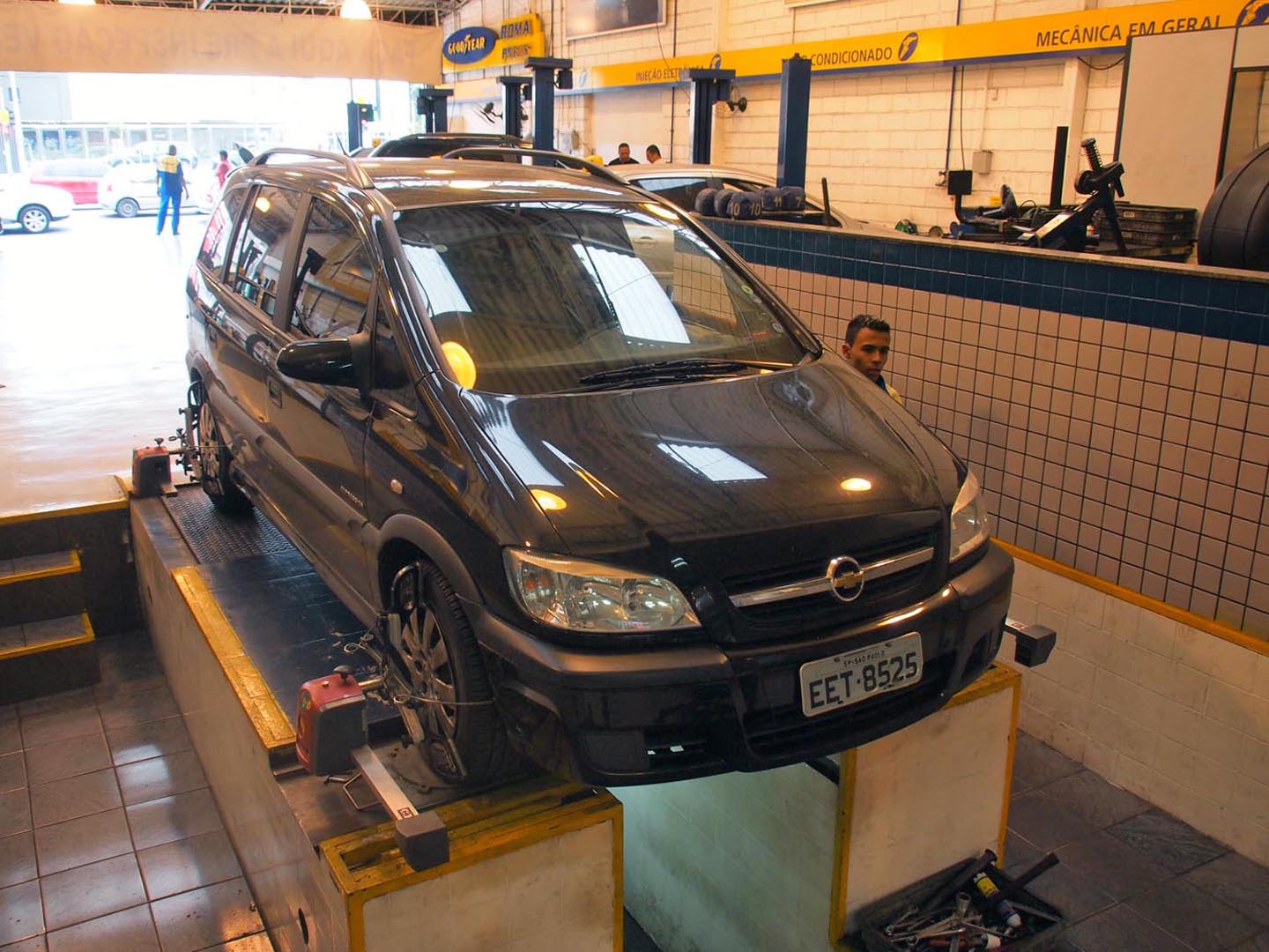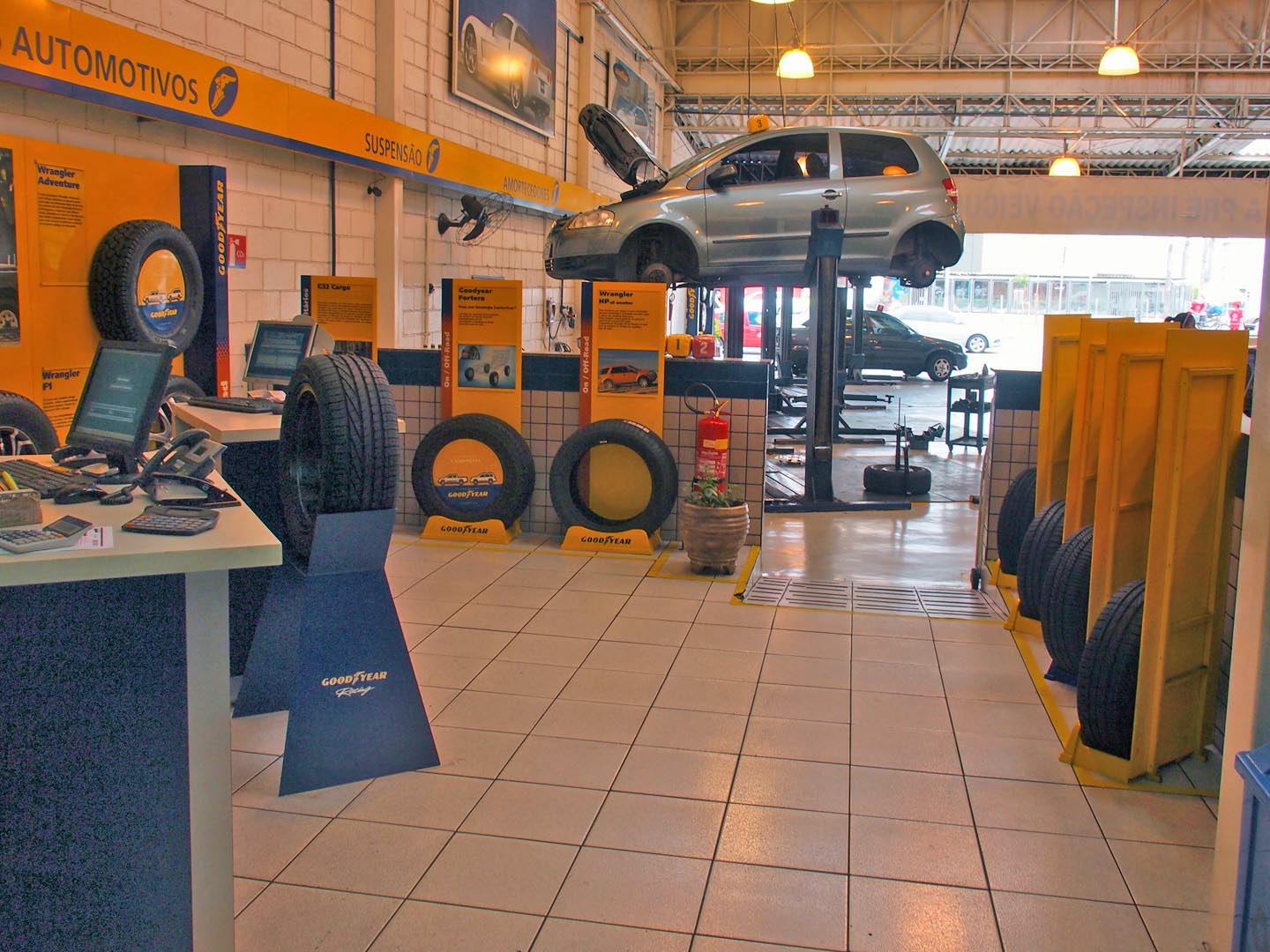 ブラジルは・・・。やはり流通・小売りの体系が整っていないところも多く、自動車のメンテナンスを行う大きな店舗が非常に少ないです。街で一般的なのは、写真のような小さな整備工場。たとえばこの店は「ブルックリンタイヤ」というらしいのですが、このような小規模の店が大半なのです。ちなみに表に白い縦長の看板にあるのは「escapamentos エスカパメントス」とは排気管、 つまりマフラー類のこと。この店ではマフラーを得意としているらしいのですが・・・。
