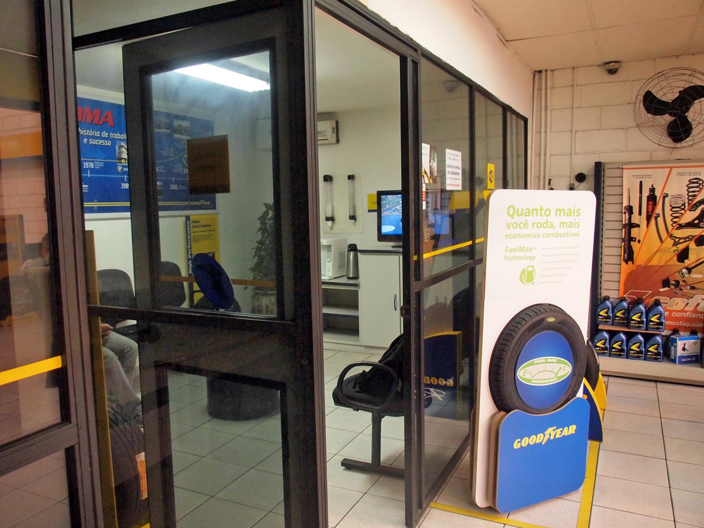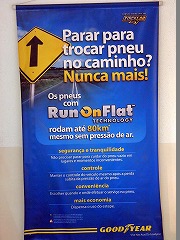 - 事務所にかけてあった看板。ランフラットタイヤの宣伝でした。路上強盗が多いブラジルでは日本とは別の意味で必要な機能かも。