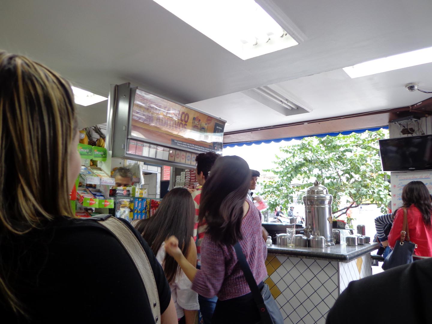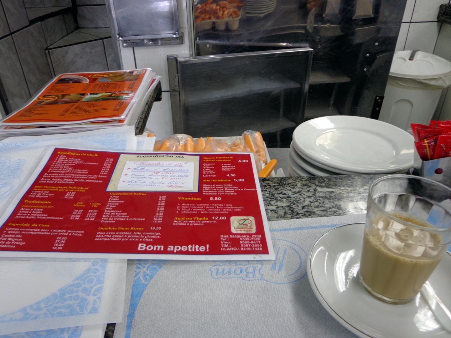 店によって多少の差異はありますが、基本的に置いてあるものは変わりません。画面右下のコーヒー牛乳は カフェ・コン・レイチ café com leite というと出してくれます。ブラジルではかなりメジャーな飲み物です。-