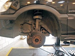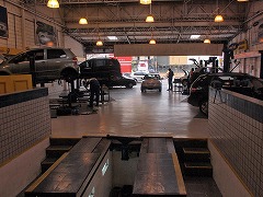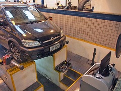- タイヤとショックアブソーバーの交換が終わればアライメントの調整です。予想と違いこんな立派な台に乗せて調整です。