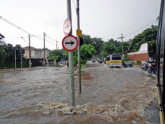 ブラジル、特に自分の住んでいるサンパウロは東京を超える大都会でブルは密集していますし、住宅街はひたすら高級な邸宅が並んでいる都市です。大都会なのにあえて中心部には大きな公園を配置するなど、(途上国にしては)頑張っているほうなのですが、大自然の脅威もハンパありません。具体的には夏の雨季(日本の1~2月ぐらい)の豪雨はものすごいです。写真の道路も普段は普通の道ですが、年に数回はこのように「ただの激流の川」状態になります。こんな時、ツルツルタイヤで走ることは、まさに自殺行為です。