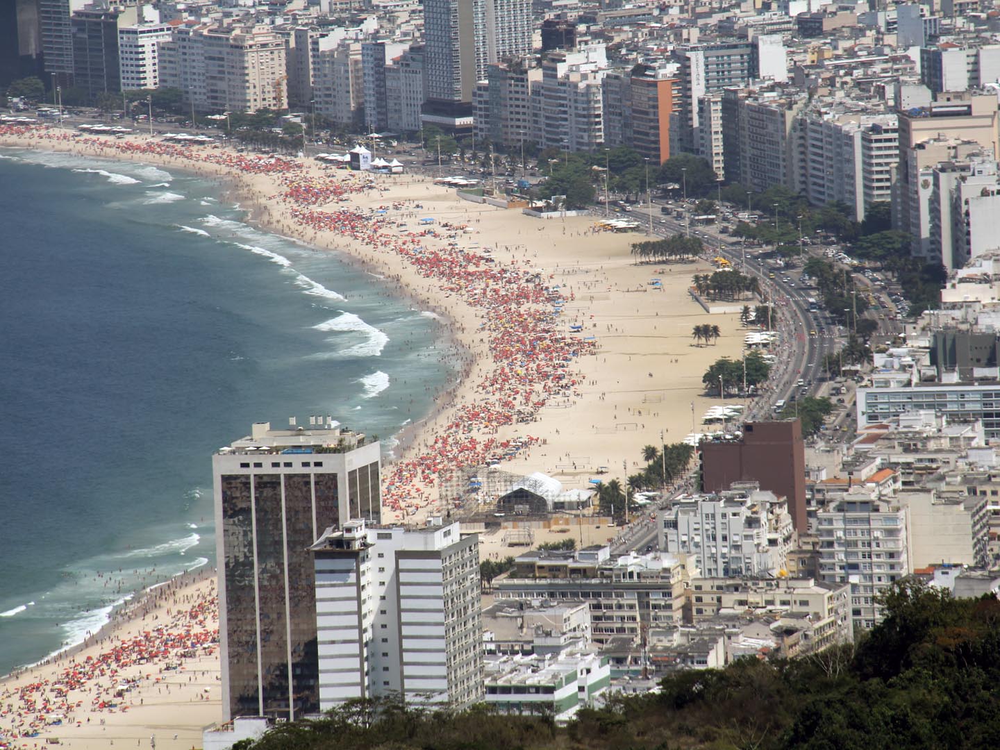 岩山の上からはイパネマ海岸と建物群が。ちなみに赤く見えるのはパラソル。これがみんなビーチに遊びに来ている人達です。ブラジル人の海好き、ハンパないっス。 -