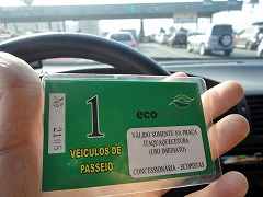 料金所渋滞の最中、一般レーンに並んでいると、歩いて料金を集めているお姉さんがいました。聞いてみると「ここで支払えるわ」とのこと。よってそのお姉さんにお金を渡すとこのカードをくれました。事前清算の証拠のカードで、ゲートではこれを手渡すだけでした。単一料金、かつ人件費が安いブラジルだからできる方式です。