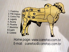 ブラジルのシュハスコにおいてなかなか重要な図。 みんなに人気があるのがピッカーニャpicanha。コントラフィレcontra filé(日本でいうサーロイン)あたりもおいしいです。