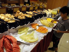 ホテルの朝食のようす。ホテルの値段と朝食の品数には厳密な相関関係があります。 -