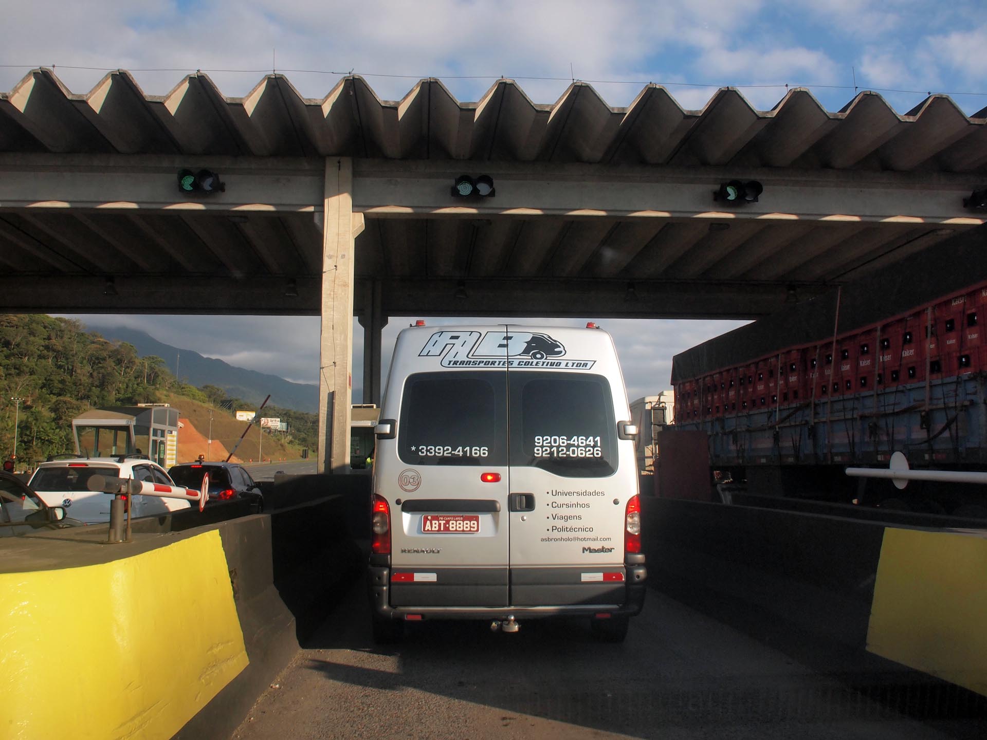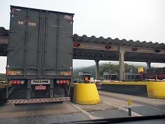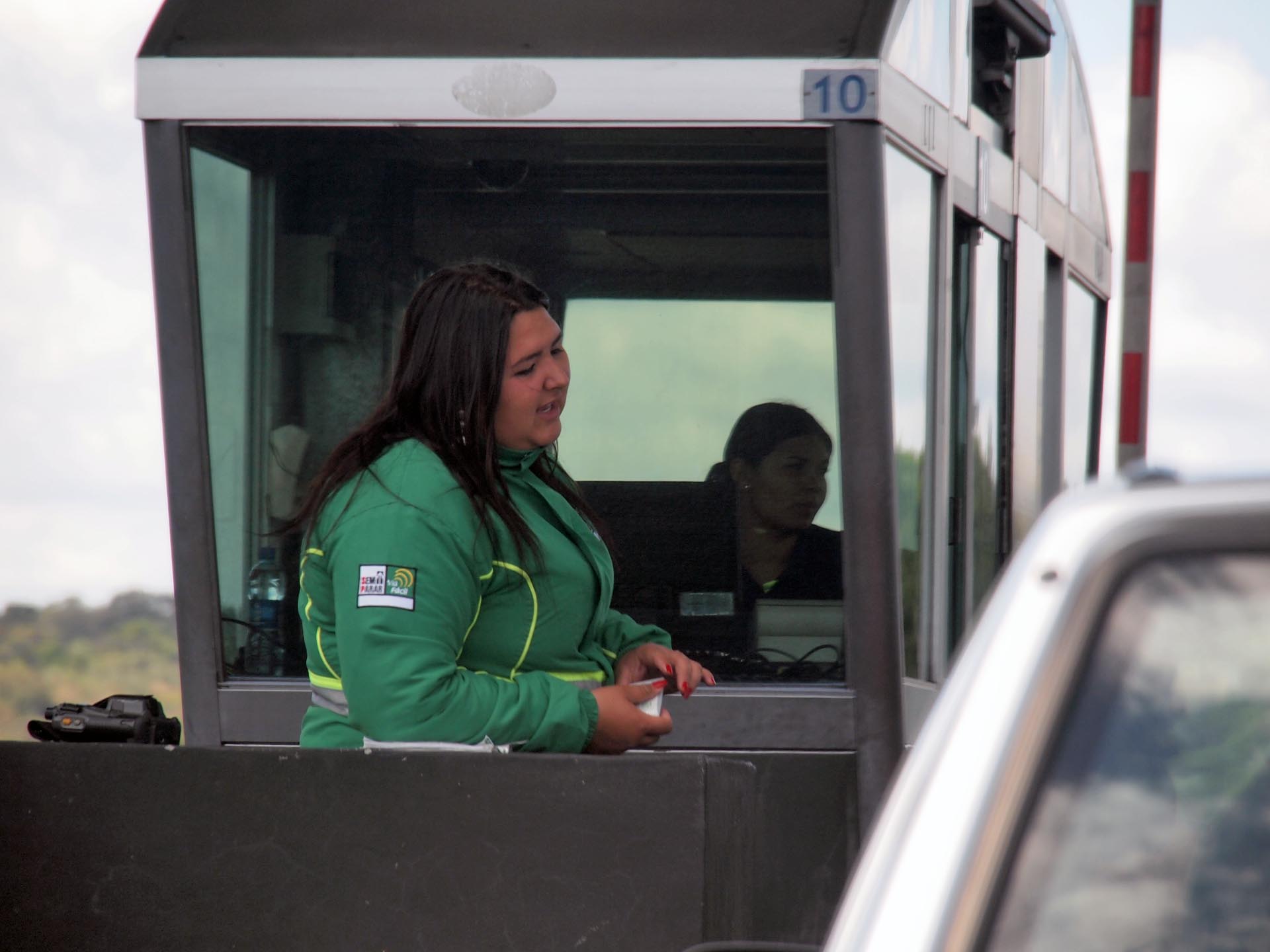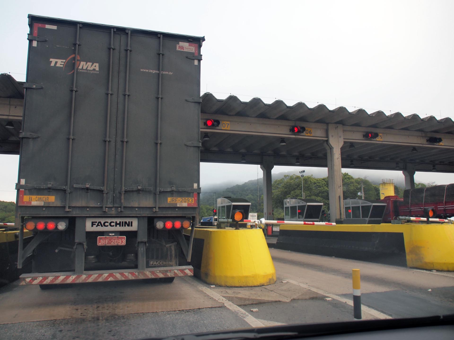 - 高速道路の料金は「入口と出口でチェックして出口で払う」方式でなく「このゲートを通る車はここで払っていけ」という単純なゲート方式なので料金所が何度も出てきます。ただし値段は日本円で数十円~数百円と非常に安く、日本の感覚からすれば”タダ同然”の値段。料金は写真奥のガラスブース内の係員に支払います。手前のおねーさんはsem parar:センパーラー(英語でいえばNon-Stop)