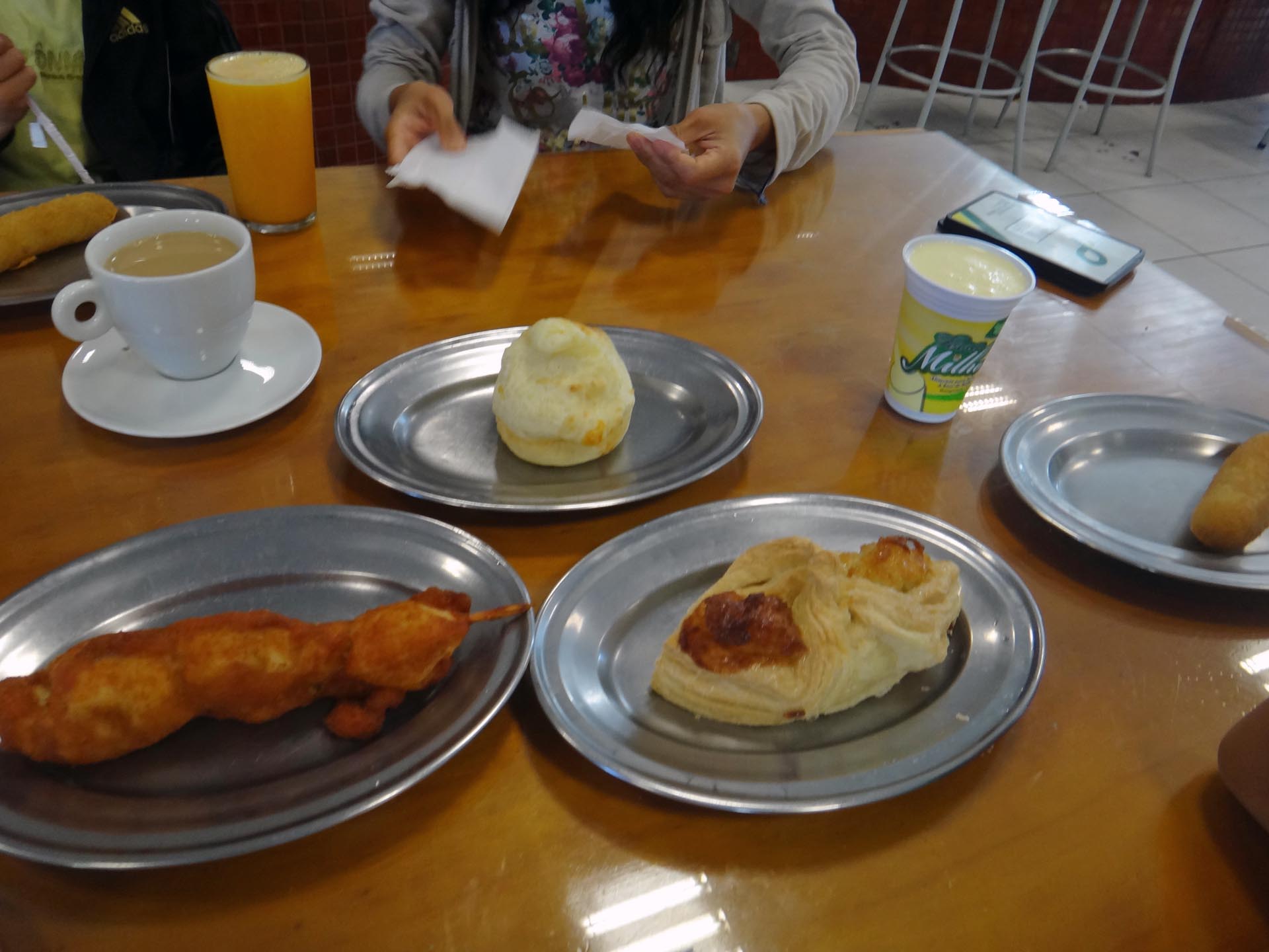 - カフェコンレイチ(Café com leite:コーヒー牛乳)とポンジケージョ(pão de queijo:チーズパン)、コシーニャ(Coxinha:ブラジルのコロッケ)など・・・。