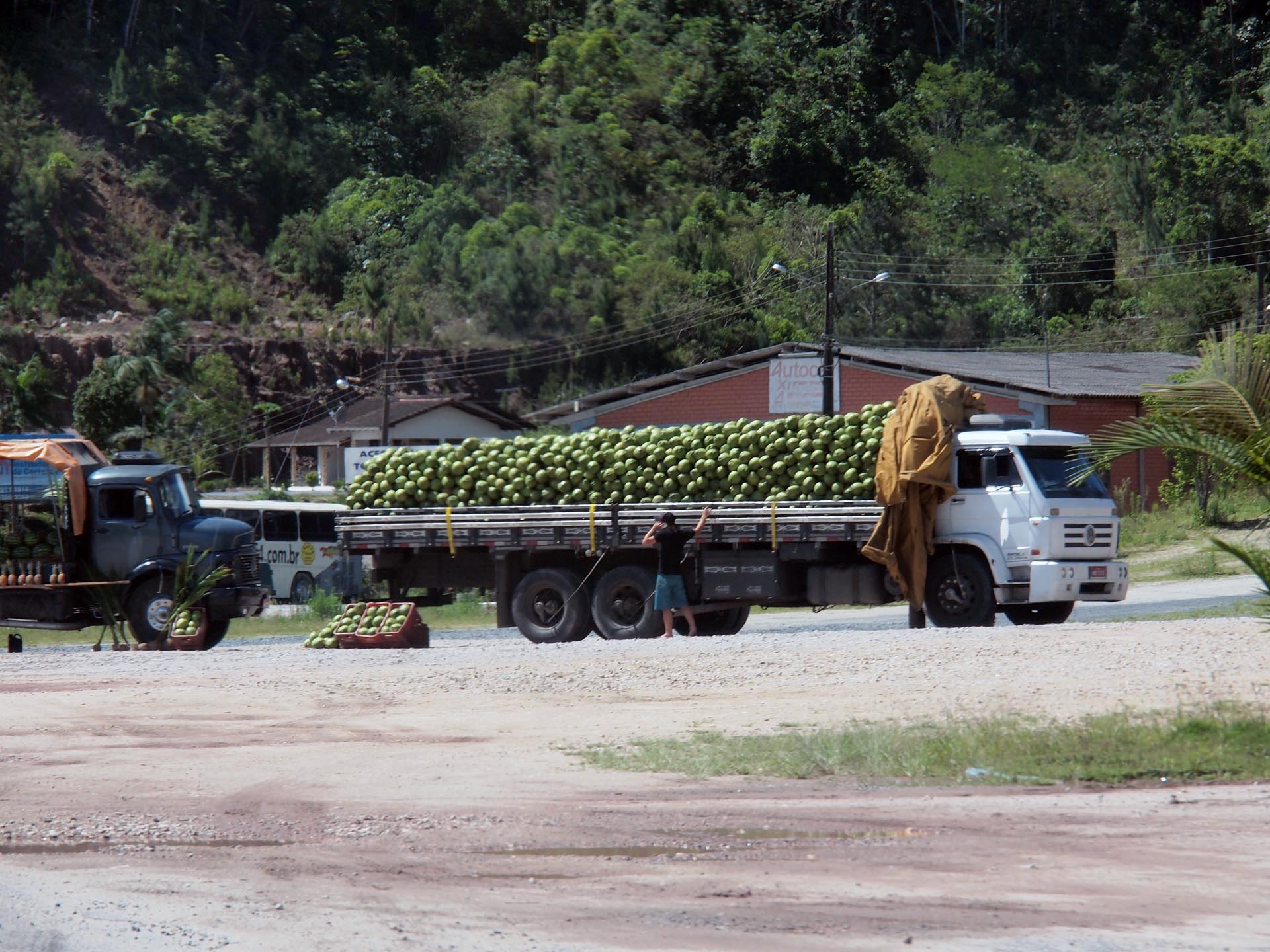 - ブラジルではヤシの実を積んだ大型トラックを見かけます。この写真は「ヤシの実を直販している」だけで不思議なものでもないと思われますが、実はこれ「違法営業真っ最中」の証拠写真です。よく考えてみれば、この量のヤシの実を、路上販売目的で運送しているはずはありません。これはつまり「遠くの街までヤシの実を運ぶように頼まれたけど、途中で休憩もかねて、荷主から預かっている商品をくすねて、勝手に小売りしている図」というのが正しい解釈です。