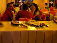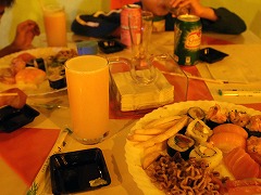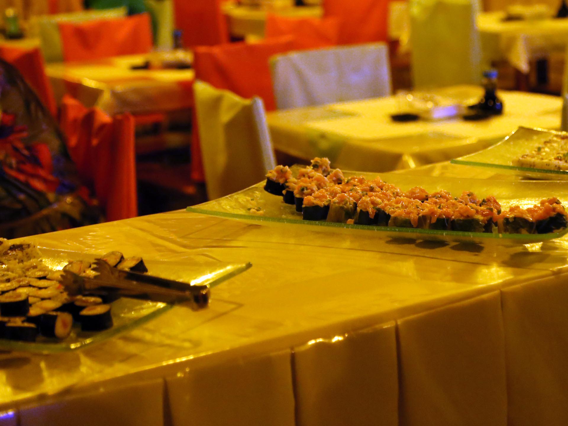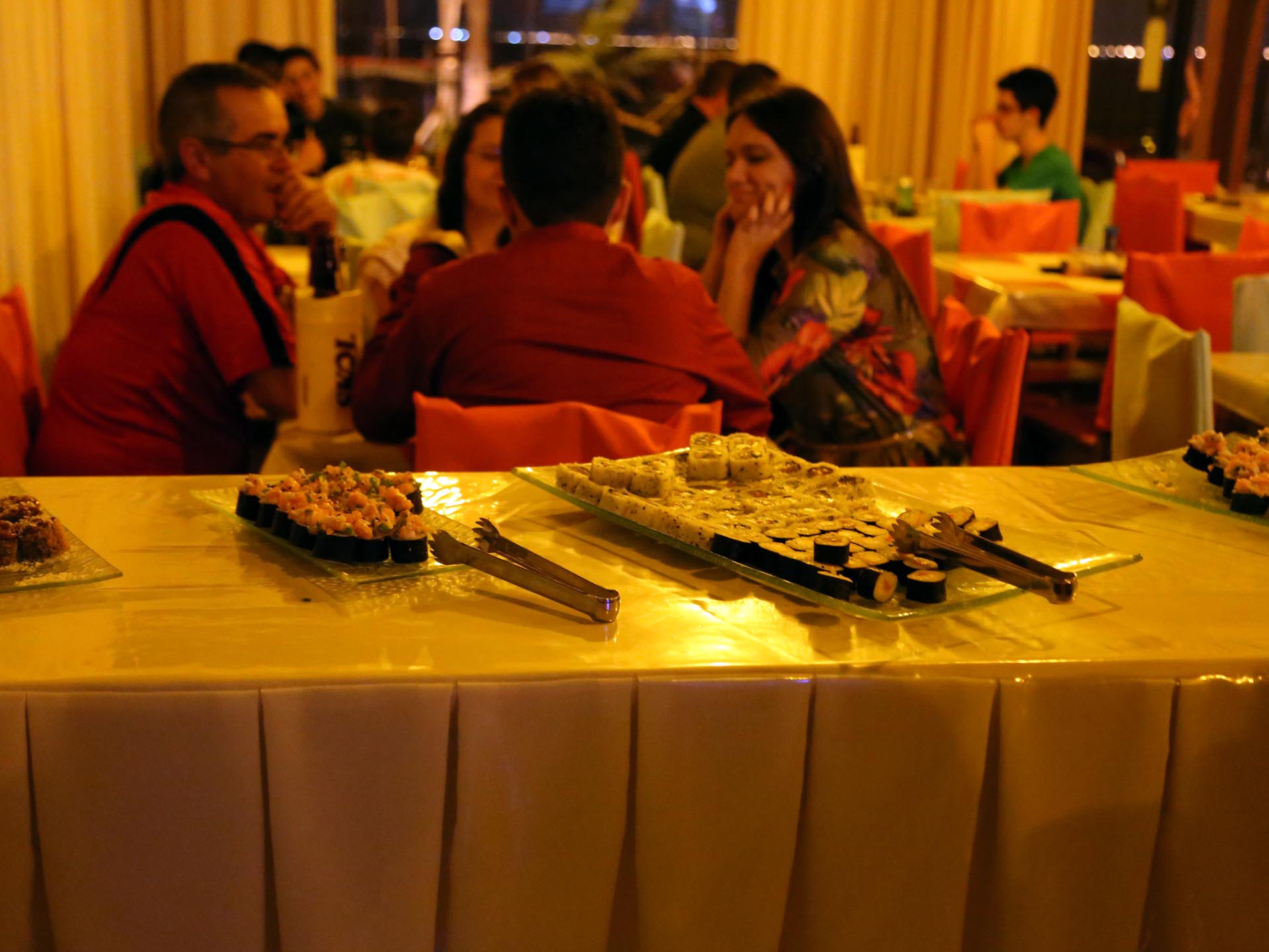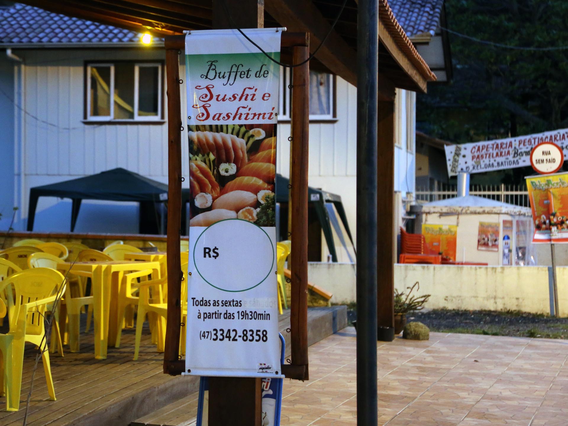 と聞いたら「今晩、ウチのとなりで寿司ビュッフェをやるよ。良かったら行ってみて」といわれたので、驚きながらも行ってみると・・・確かにBuffet de Sushi e Sashimi(寿司と刺身のビュッフェ)の看板が・・・。