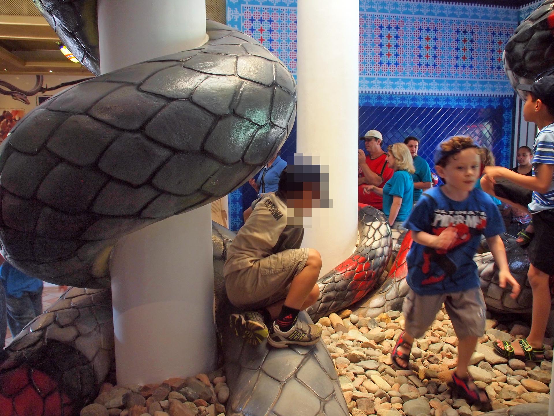 - そんな感動もあったのですが、やはり謎コンセプトなものも多数。例えばこれはヘビの展示室なのですが、最大の展示は作り物のアナコンダ(超大型ヘビ)で、生きたヘビは小さいものがごくわずか・・・。
