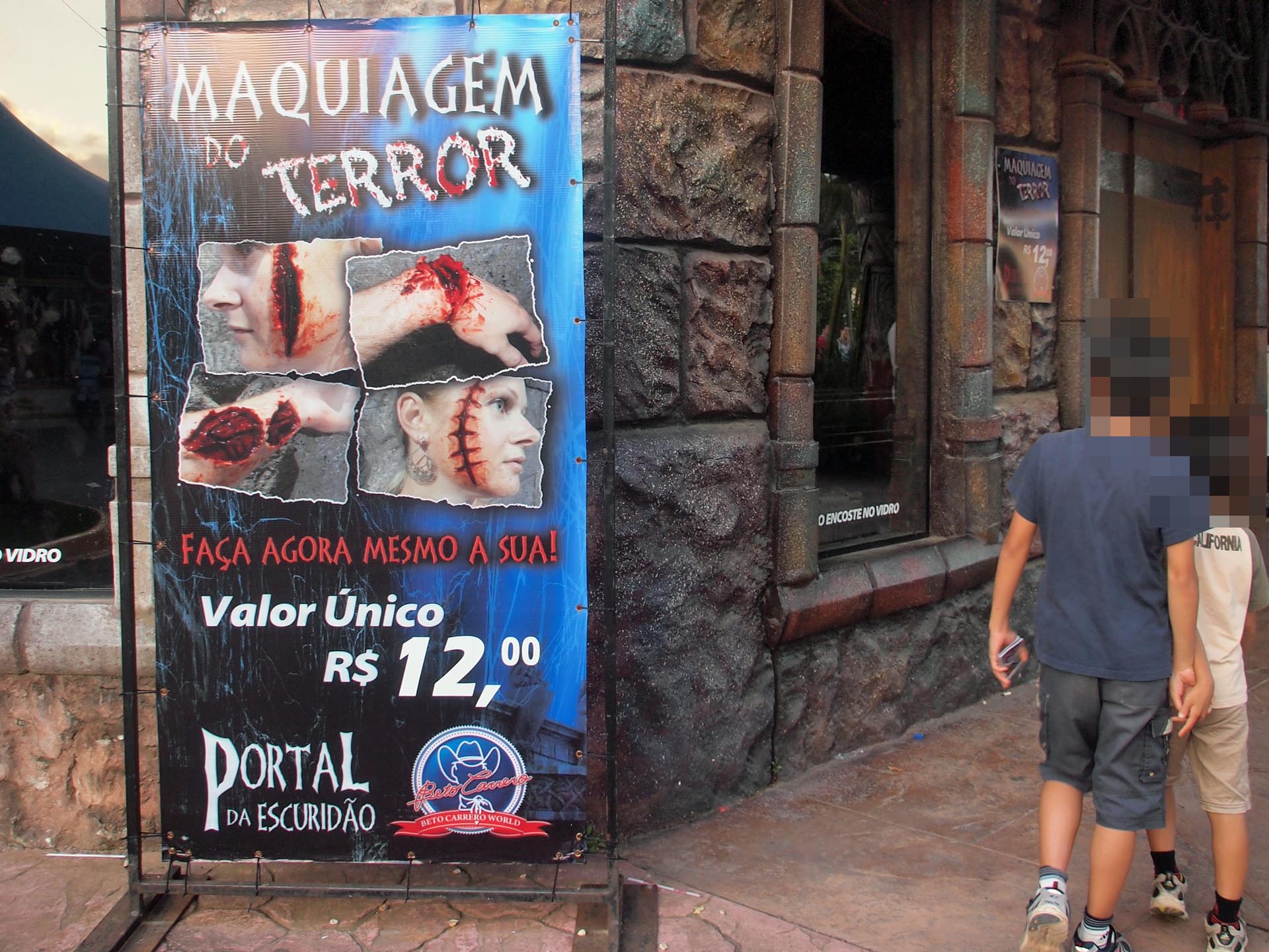 - こんな看板を発見。観客の中に、腕や顔にものすごい傷を負った人が何人もいて、かなり驚いたのですが、こういう特殊メイクをしていたんですね。1回、500円ほどとかなりリーズナブルなお値段です。