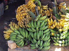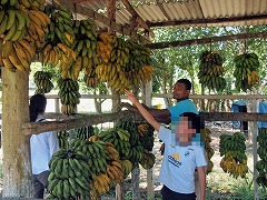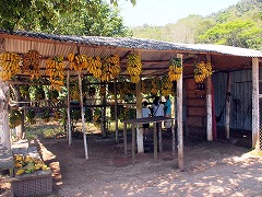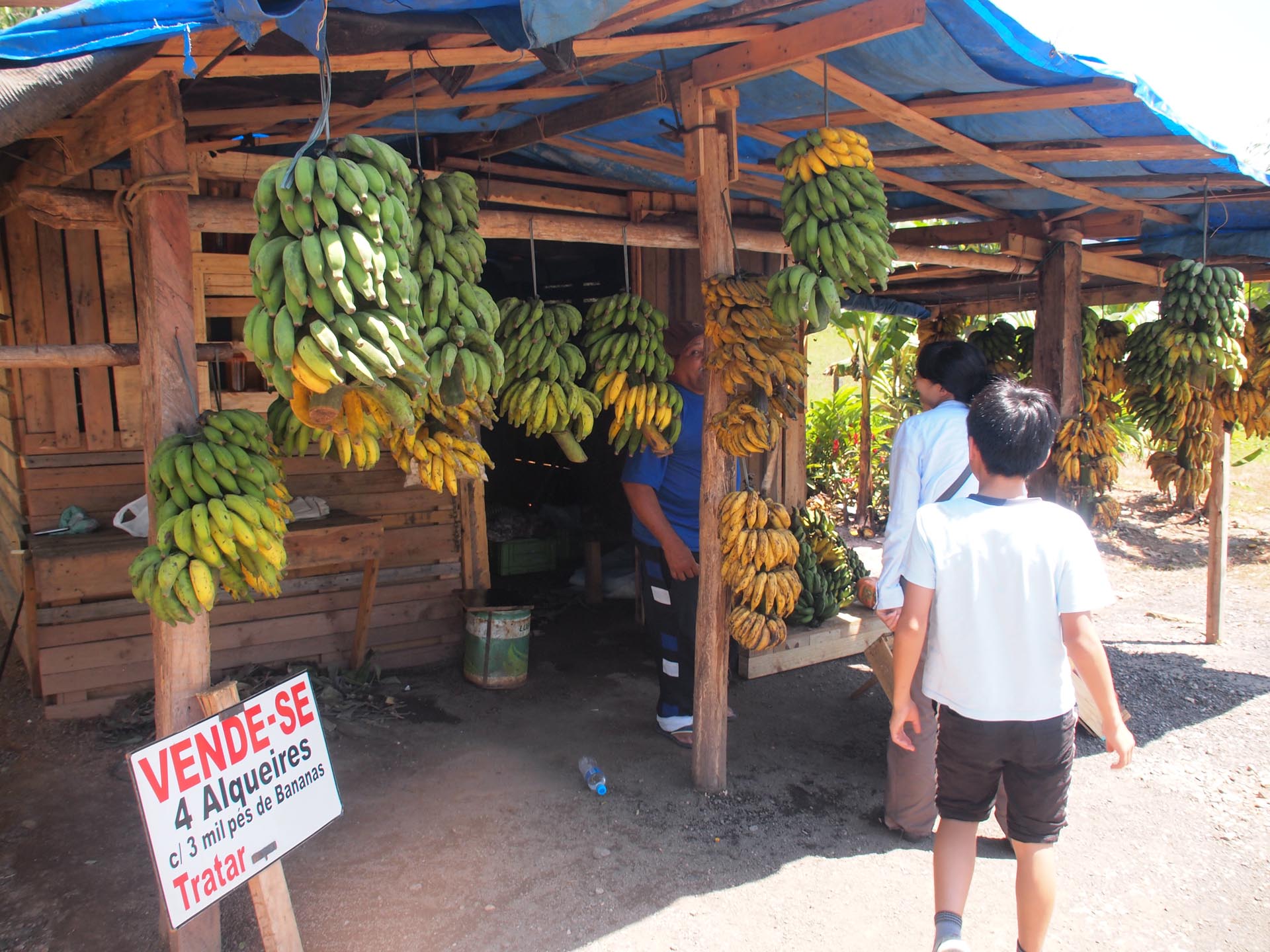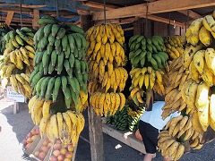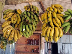 - 店には各種バナナがそのまま吊り下げてあります。写真では見にくいですが、値段もきちんと表示されていて安心。