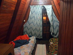 - さて、秘密小屋のような部屋で就寝です。こどもは2階を占領して大騒ぎ。寝具は値段相応ですが、それはそれでいい経験。