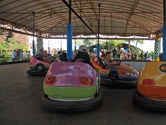 - ブラジルの遊園地の定番、電気で走る車がありました。天井に電流を流した金網が貼ってあり、そこに向かって柱の電極が伸びていて、その柱がパンタグラフのように集電端子となり車に電気を供給する仕組みです。床は金属製の鉄板が敷いてあり、陰極はそこに。ちなみに車はどんどんぶつけあうのが普通なカオスな遊具です。