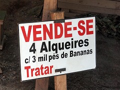 - 気楽に見えるバナナ販売のお店ですが、いろいろ厳しいらしく、「土地売ります」との看板がありました。「面積4アルケイレの農地を売ります。3000本のバナナの木あり」とのこと。アルケイレalqueireとは、ポルトガル・ブラジルで使われていた面積の単位で、しかも土地によって大きさが異なるもの。サンパウロ式のアルケイレ・パウリスタ(alqueire paulista)で計算すると1アルケイレは、24,200平方メートル。つまり1アルケイレは242a。4アルケイルとなると10ha(1km×100m)ほどでしょうか?ちなみに、サンパウロの農家では、100アルケイル以下の農家は弱小農家とみなされるそうな。なんとも恐ろしい話です。