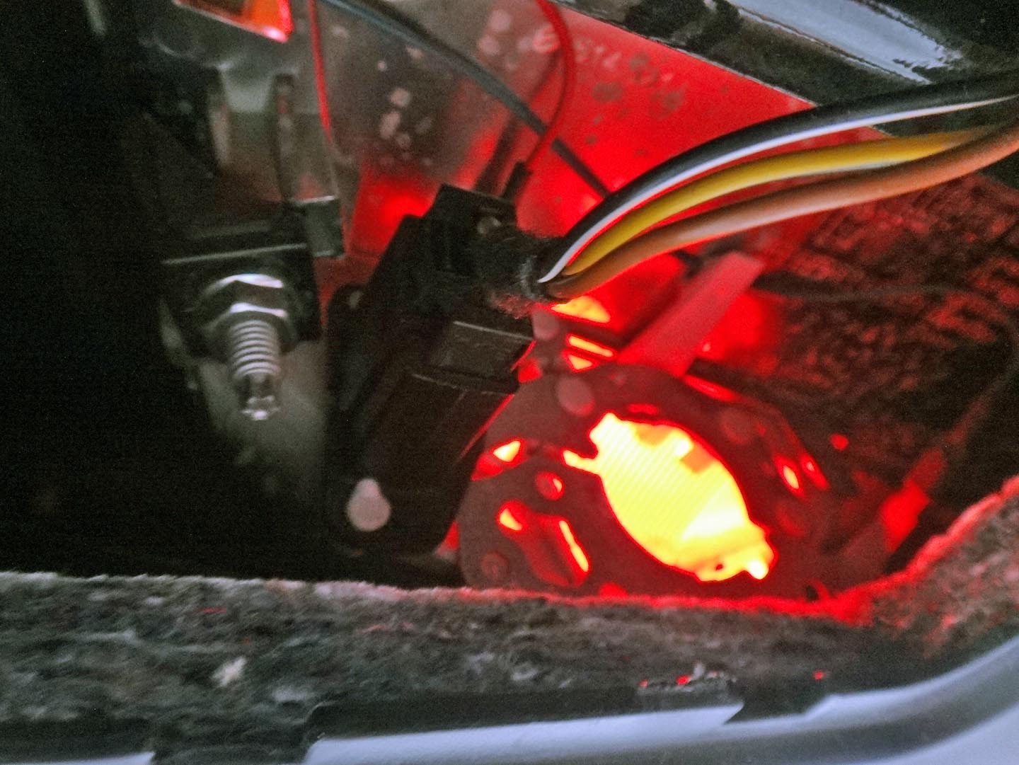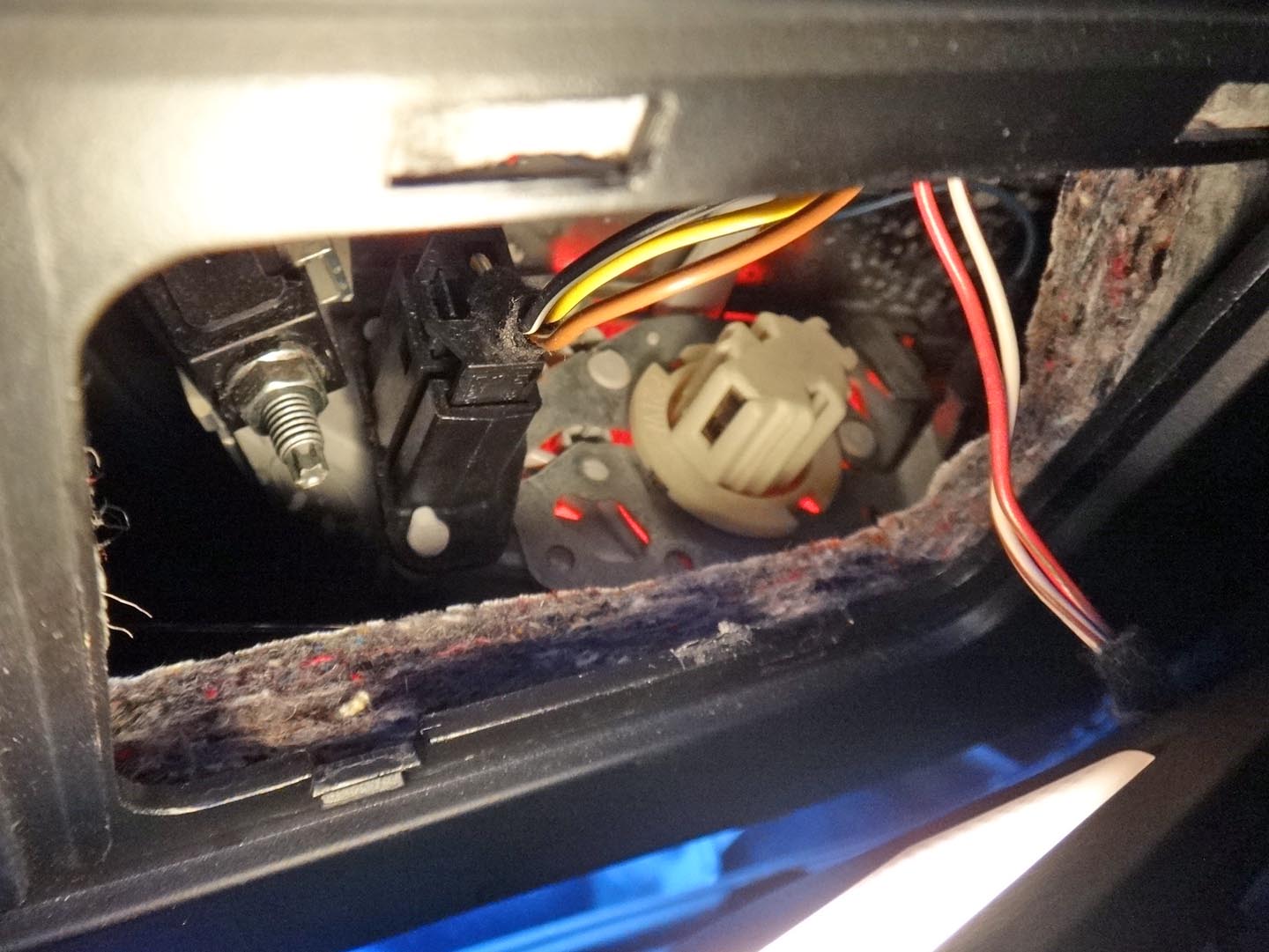 バックドアの室内灯ランプをはずすとリアコンビランプの裏側に手が届きます。目指すリアフォグのバルブは写真真ん中右の白いつまみのようなもの。BMWの標準的なバルブソケットなので、BMWを少しでもいじっている人にはお約束の部品です。