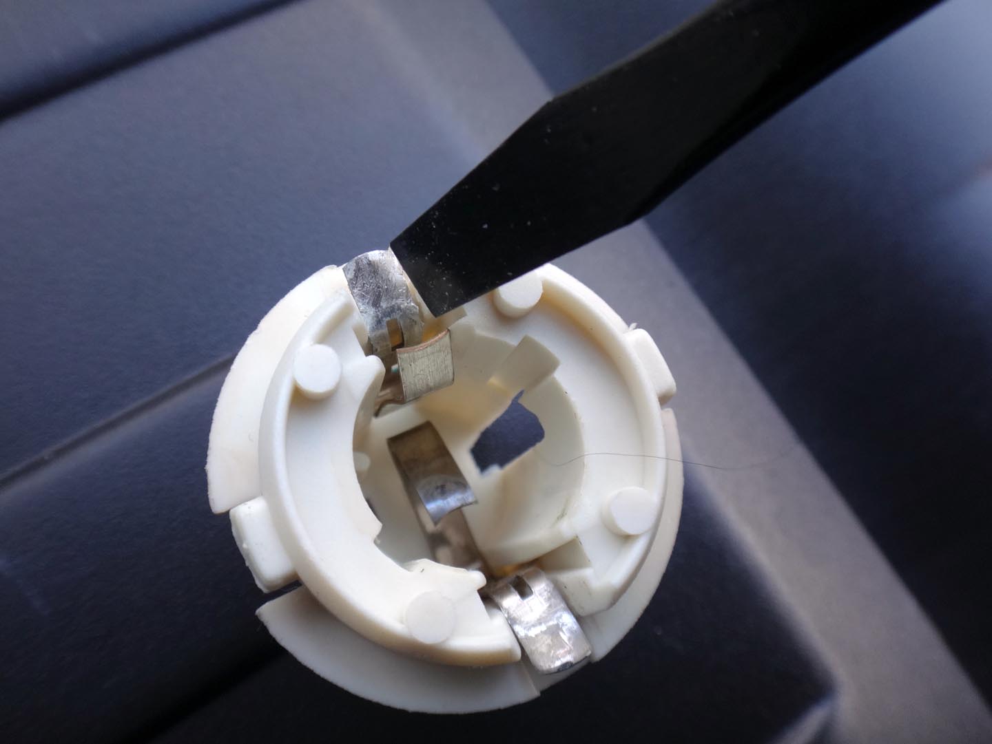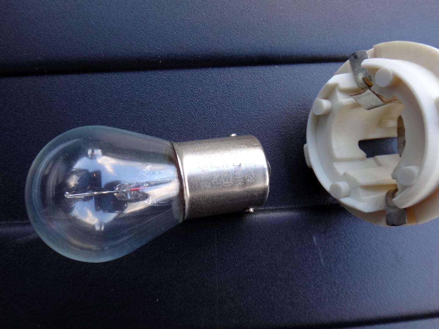 これが取り出したリアフォグバルブ。目視しても切れていません。念のためテスターで測っても断線はなし。どうやら単なる接触不良のようです。