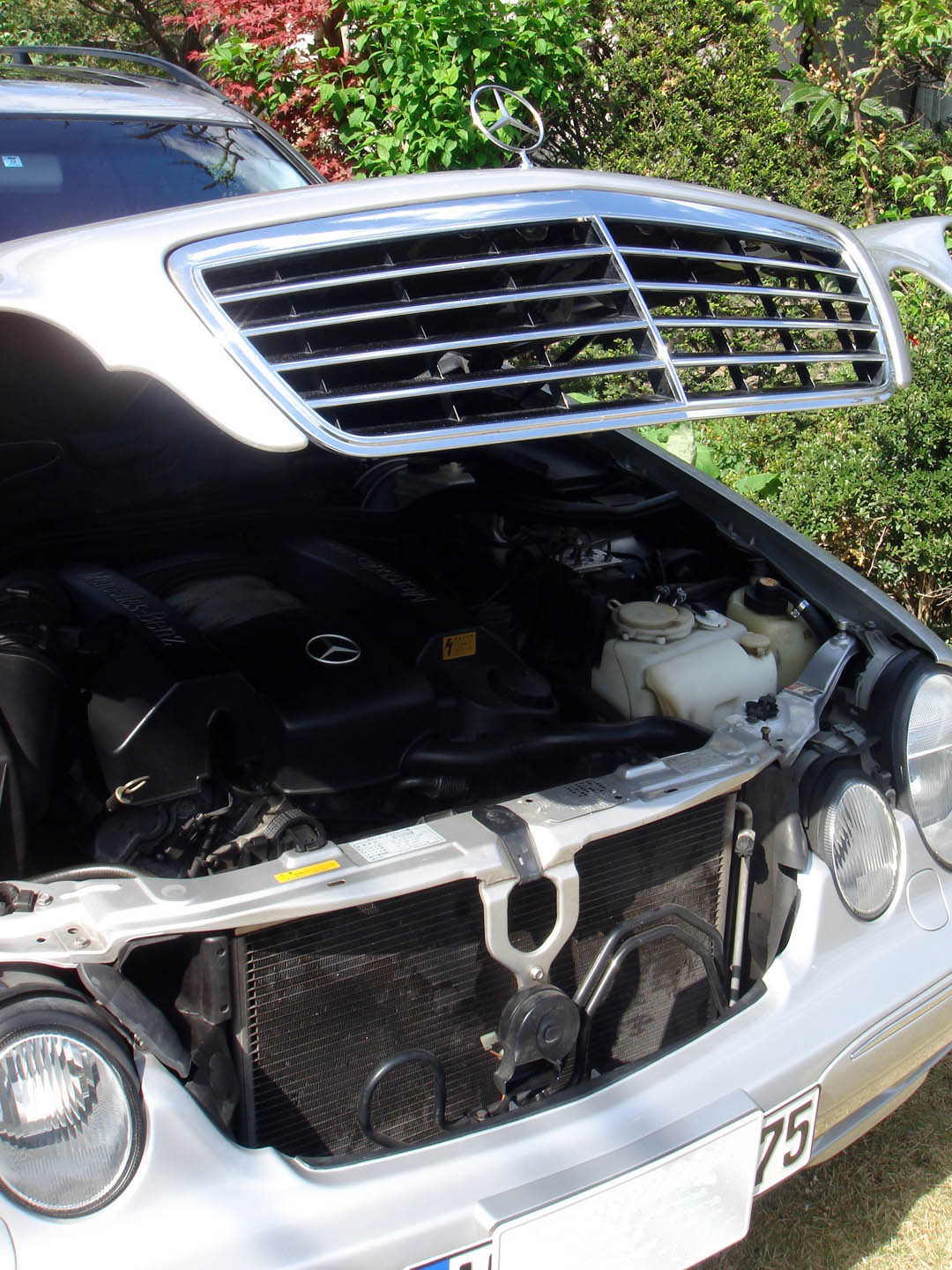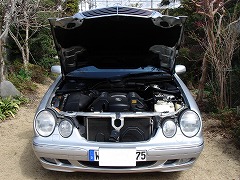 さて、エンジンをみてみましょう。3.2L V6のエンジンがおさめられているボンネットを開けた図です。メルセデスお約束のグリル一体型のボンネットフードを開けると・・・・。