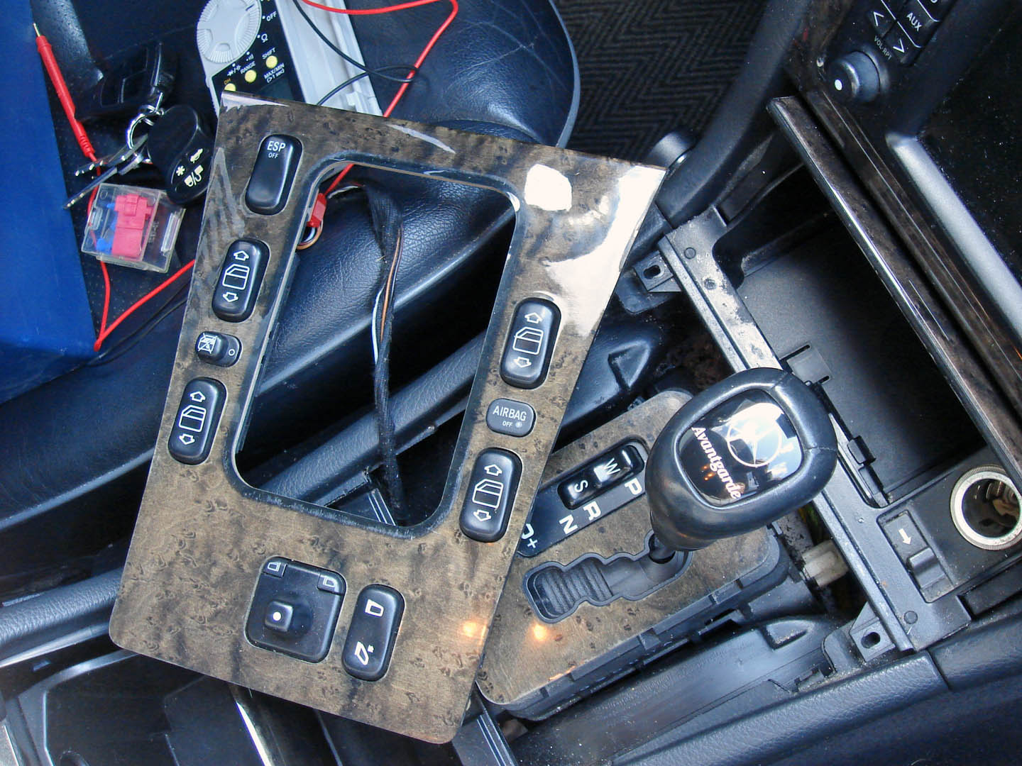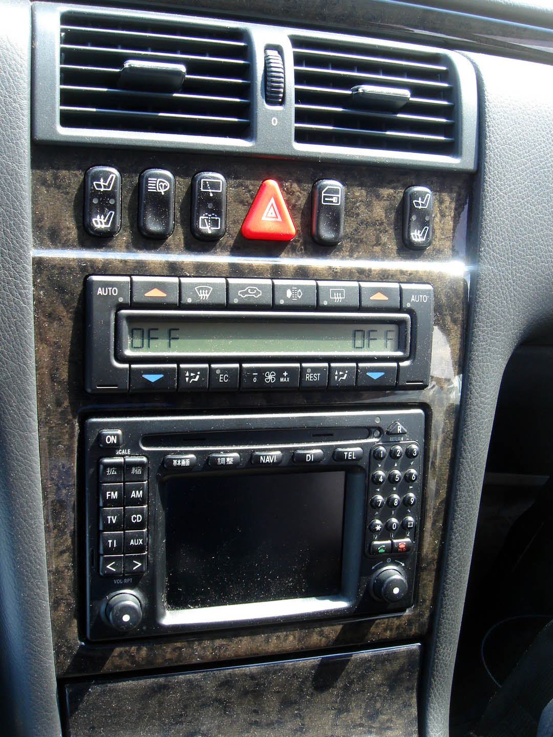 インパネセンターの様子。今から見れば古い感じですが、この時代のメルセデスの作りはこんな感じが多かったように思います。ハザードスイッチの両側にある長いスイッチは左から、運転席シートヒーター、ヘッドライトウオッシャー、リアワイパー、(ハザード)、キーロック、助手席シートヒーターです。日本車や他の欧州車と違い、「ハンドル回りのスイッチはできるだけシンプルに」という哲学を持つメルセデスですので、リアワイパースイッチがここにきています。