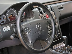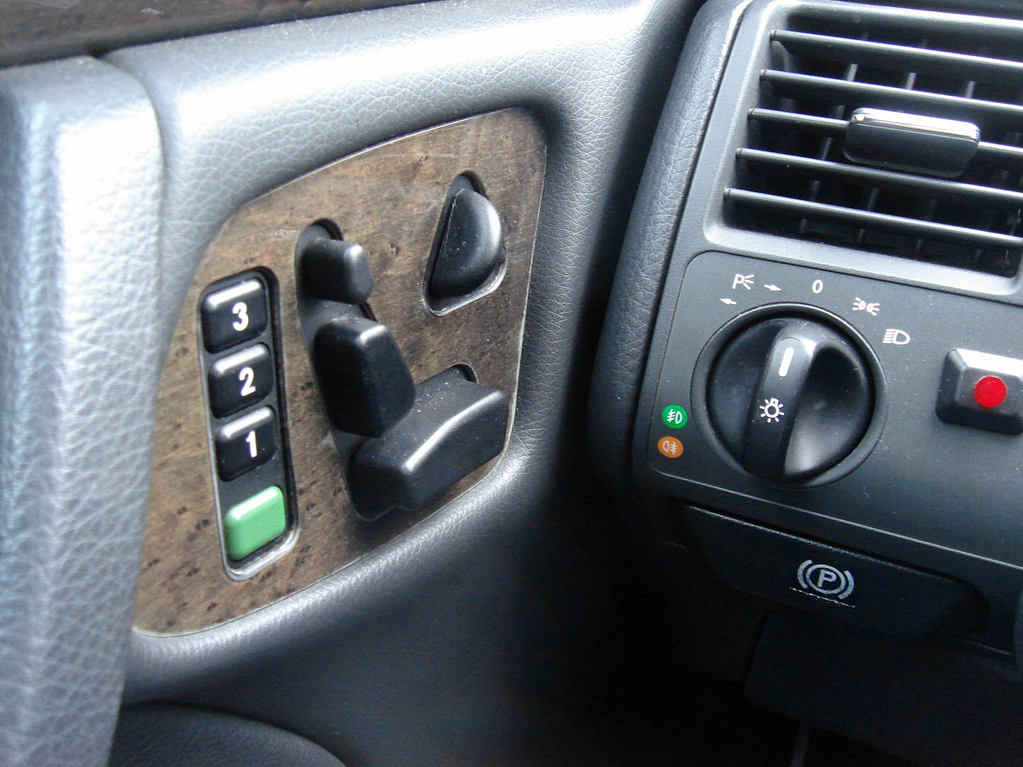 右側の丸いスイッチがこれも輸入車のお約束、インパネ横にあるヘッドライトスイッチです。BMWなどはこの付近に「フォグランプ」「リアフォグランプ」スイッチを付けるのですが、このこんなところにも「操作系は単純に」というメルセデス哲学が見えます。この丸いスイッチを引くとフォグランプが、さらに引くとリアフォグが点灯する優れ物スイッチです。ちなみ、左はパワーシートとステアリングの操作系ですが、これも実際の形になっていて操作に悩みません。このハンドルの形のスイッチを動かすと上下・前後に移動しますし、ヘッドレストすらこれで動きます。