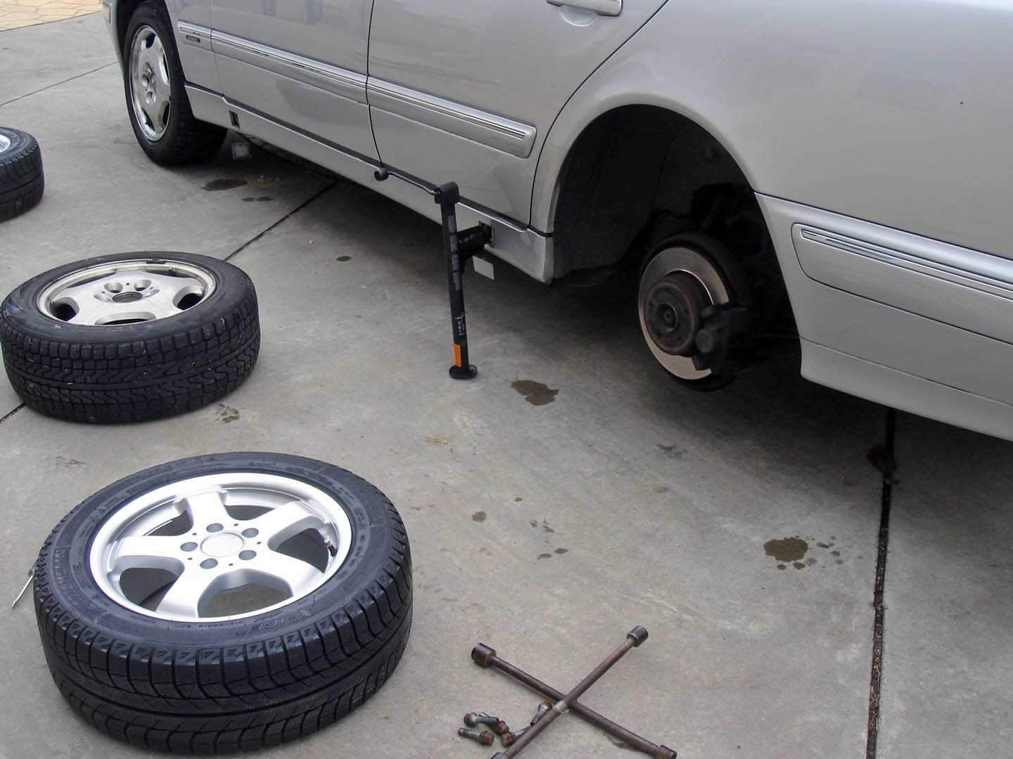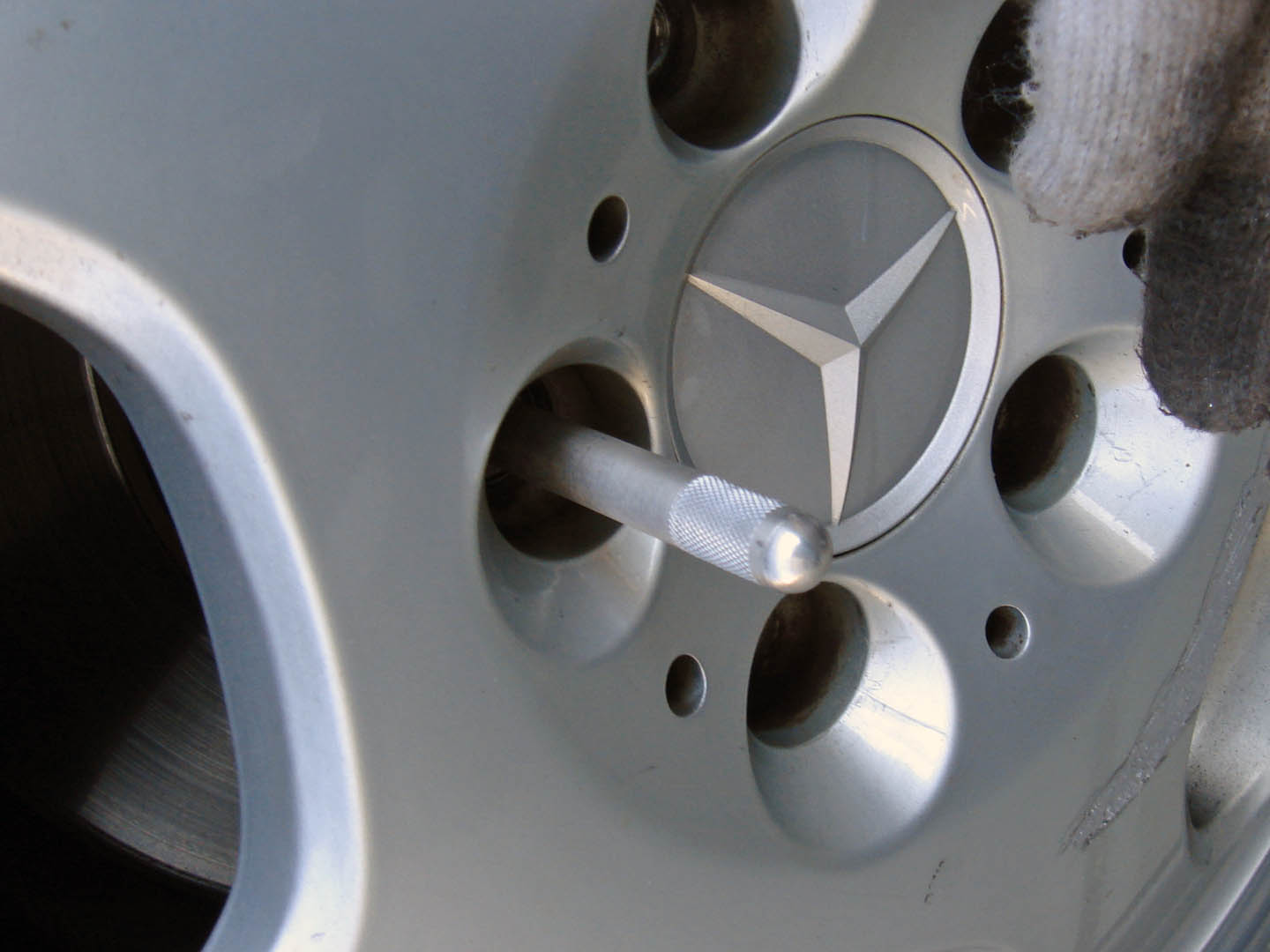 欧州車の基本、ボルトで締めるホイールです。取りつけ時が楽になるようにボルト穴のガイドが車体に付属していました。