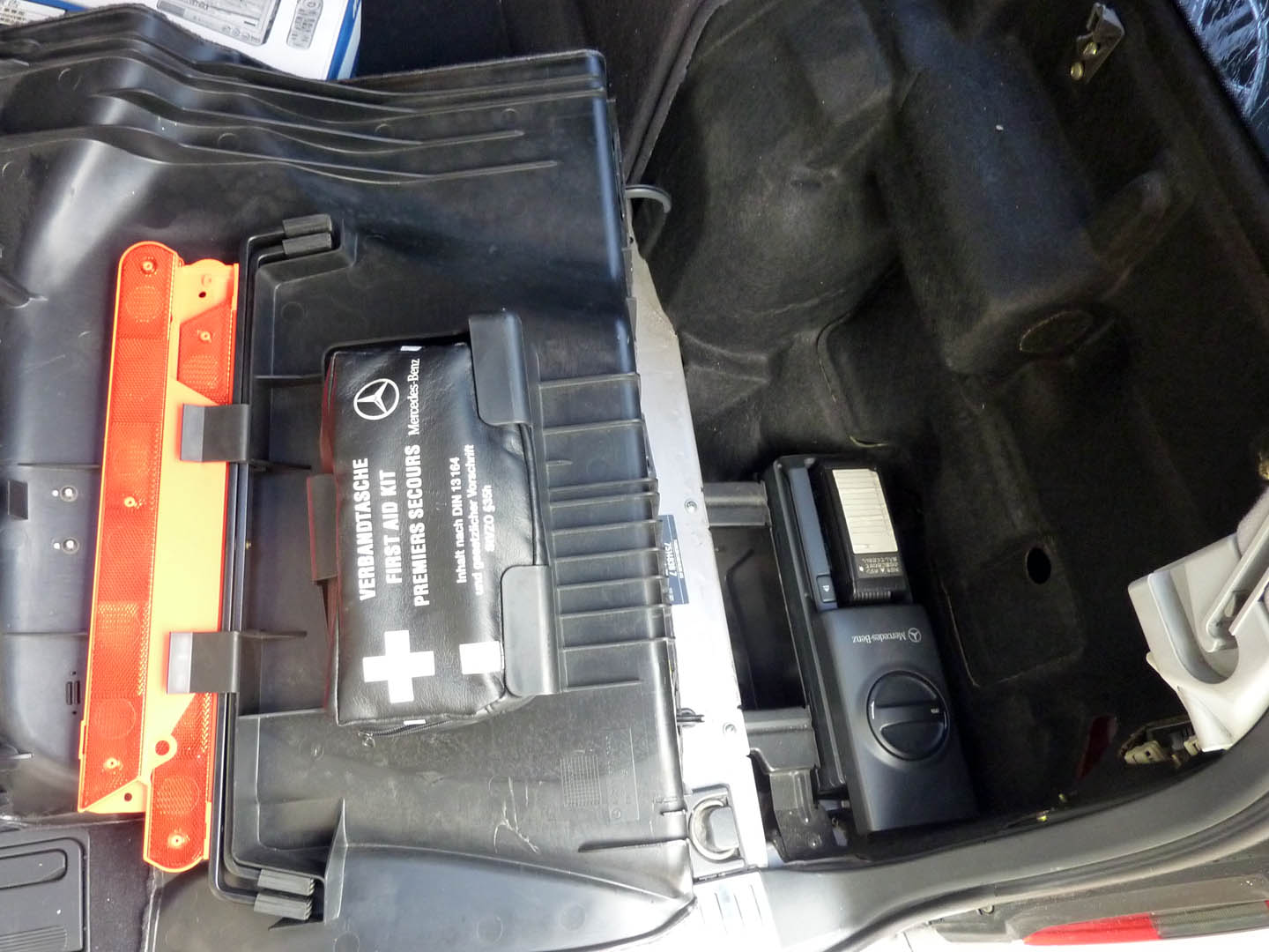ドイツの国内法によって、ファーストエイドキットと非常用三画板がリアサイドに収められています。ちなみに12連装のCDチェンジャー(パナソニック製)もここにあります。