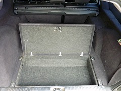 このW210系のワゴンは荷室が広く、席が3列設置できそうな程なのですが、実際に前期モデルは荷物室に3列目のシートが格納されていました。ただしあまり実用的でなかったということで、後期モデルには廃止されその代わりにこんな収納スペースになっています。ないよりましですが、深さ20cmほどで「うーん、何に使えばいいんだろう」という感じでした。