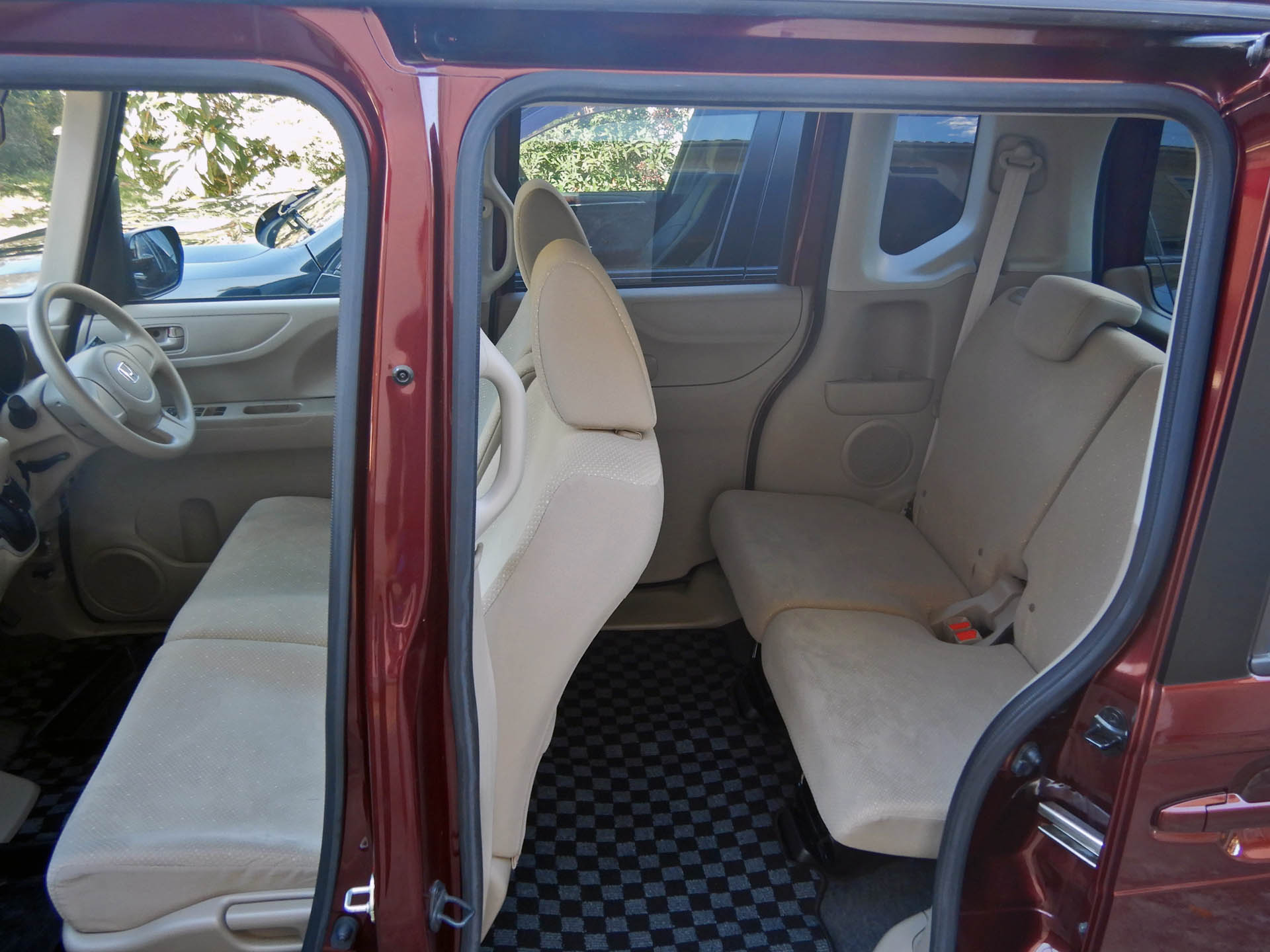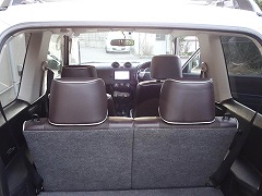 広い・・・という表現には当てはまらない室内。高さはそこそこあるのですが、足元の余裕はほとんどなく、大人がリアシートに乗るのはつらいでしょう。でも大勢が乗る車でないのでいいんです。特に、1人で乗っていて、リアに置いてある荷物を撮りたくなった時、なんでもすぐに手が届く距離感が良いですね。ちなみにシートは深い茶色の合皮製。ちょっとした高級感を演出しているのかなぁ・・・。